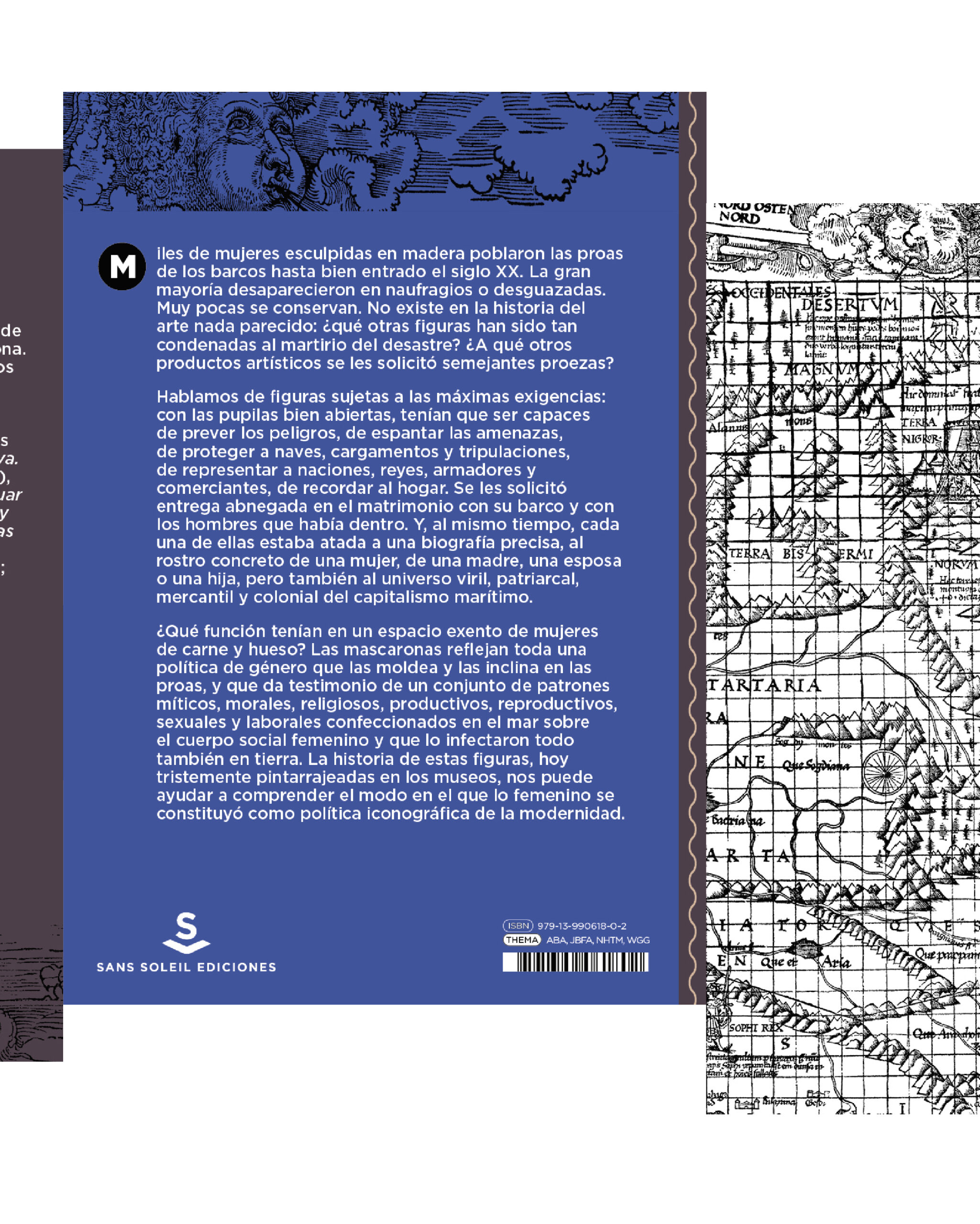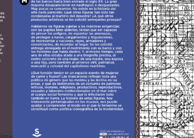 ¿Qué función tenían en un espacio exento de mujeres de carne y hueso? Las mascaronas reflejan toda una política de género que las moldea y las inclina en las proas, y que da testimonio de un conjunto de patrones míticos, morales, religiosos, productivos, reproductivos, sexuales y laborales confeccionados en el mar sobre el cuerpo social femenino y que lo infectaron todo también en tierra. La historia de estas figuras, hoy tristemente pintarrajeadas en los museos, nos puede ayudar a comprender el modo en el que lo femenino se constituyó como política iconográfica de la modernidad.